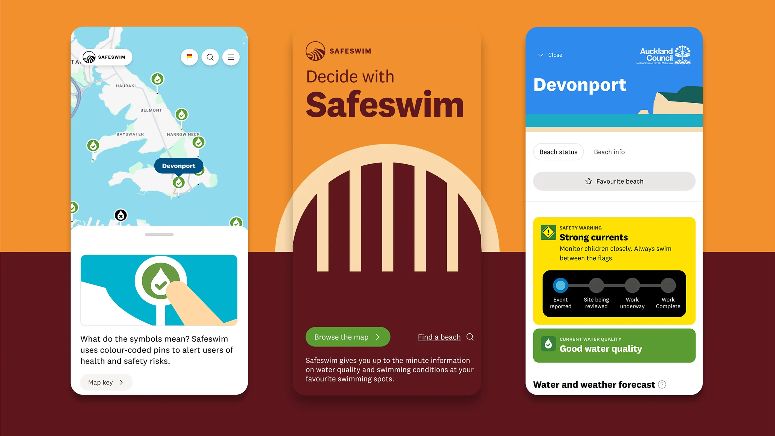 Safeswim is a website and mobile app that helps Aucklanders make smarter choices in the water by providing real-time updates on water quality, swimming conditions, and safety alerts. Alongside the digital products, we created an engaging campaign to educate the public on the benefits of using the platform. Simple, playful illustrations paired with punchy messaging made the information clear, accessible, and fun for users of all ages.